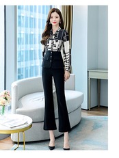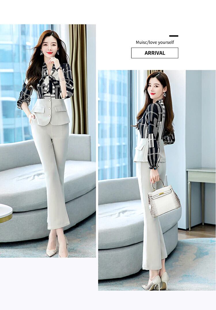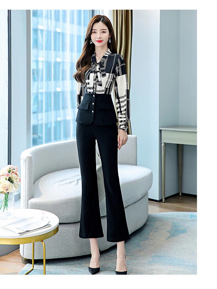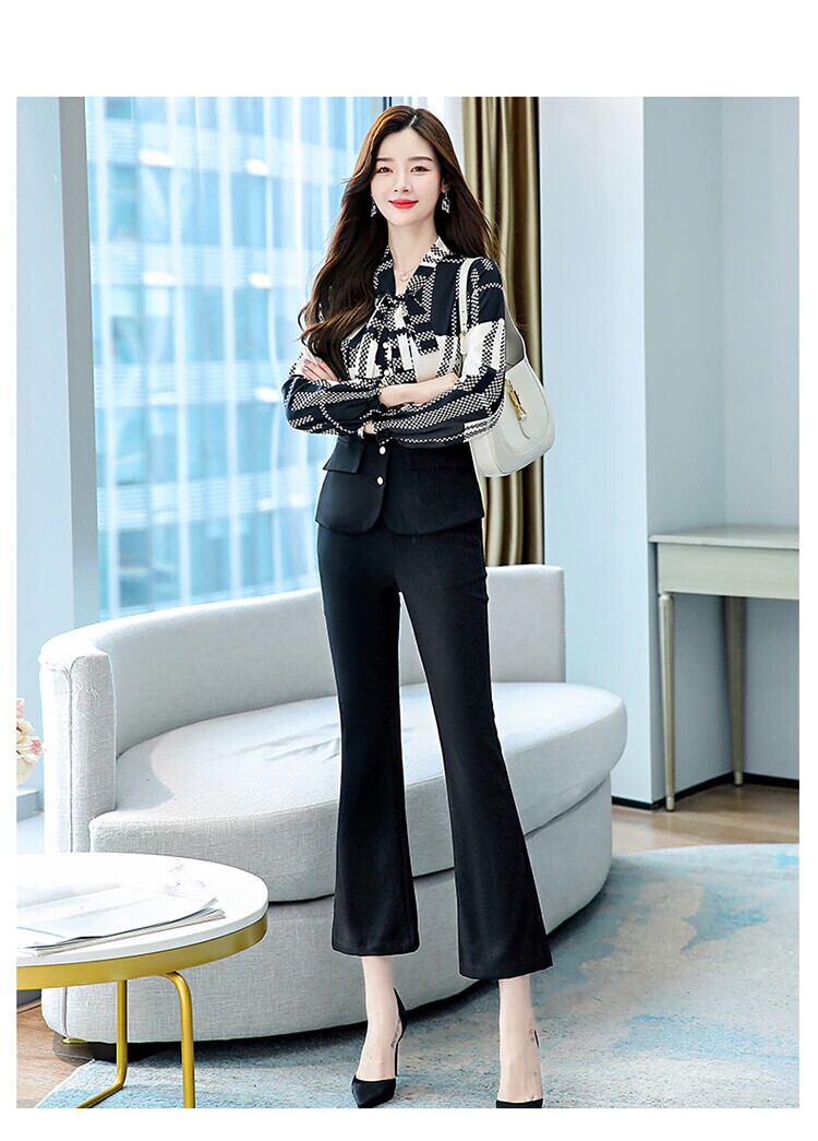 秋のOL 2点セット長袖レースアップ襟プリントボタンスプライシングトップウエストフレアパンツ女性オフィススーツ ロング レッド オータム 秋物 会社 学校 通勤や通学にも