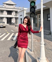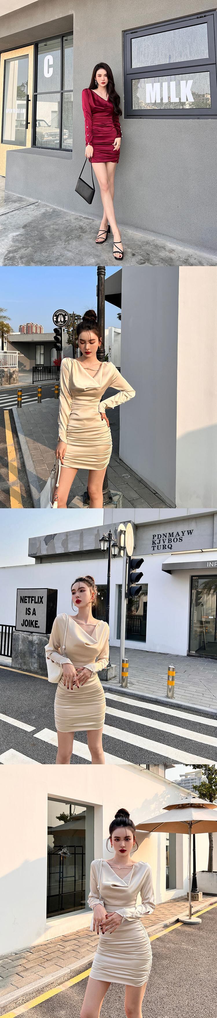 セクシーなボディコン女性長袖 V ネック襞サテンドレス春夏ソリッドナイトクラブパーティーミニドレス服 ロング スプリング 春物 サマー 夏物 Vネック ソリッドカラー