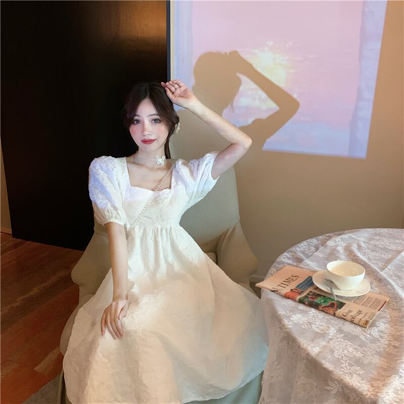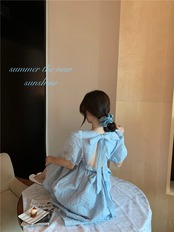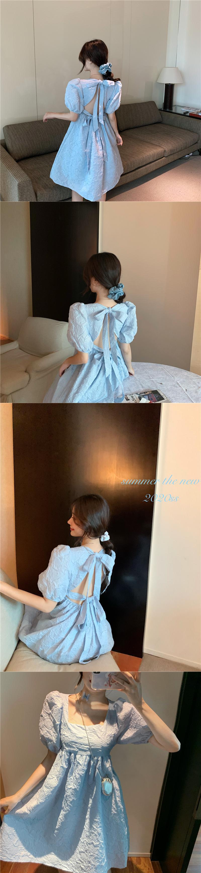 レトロコートスタイルスーパーフェアリーボウパフスリーブスクエアカラーパフィードレスホワイトブルーバックレスレディースサマーサンドレス リボン 夏物 スクウェア