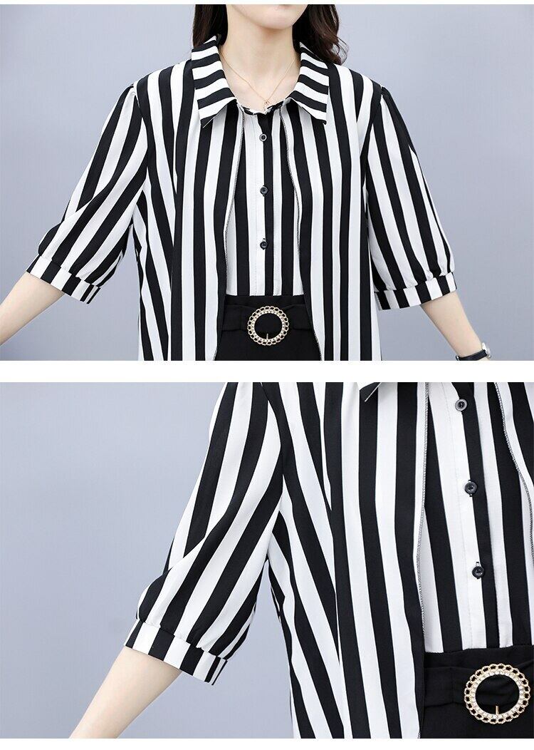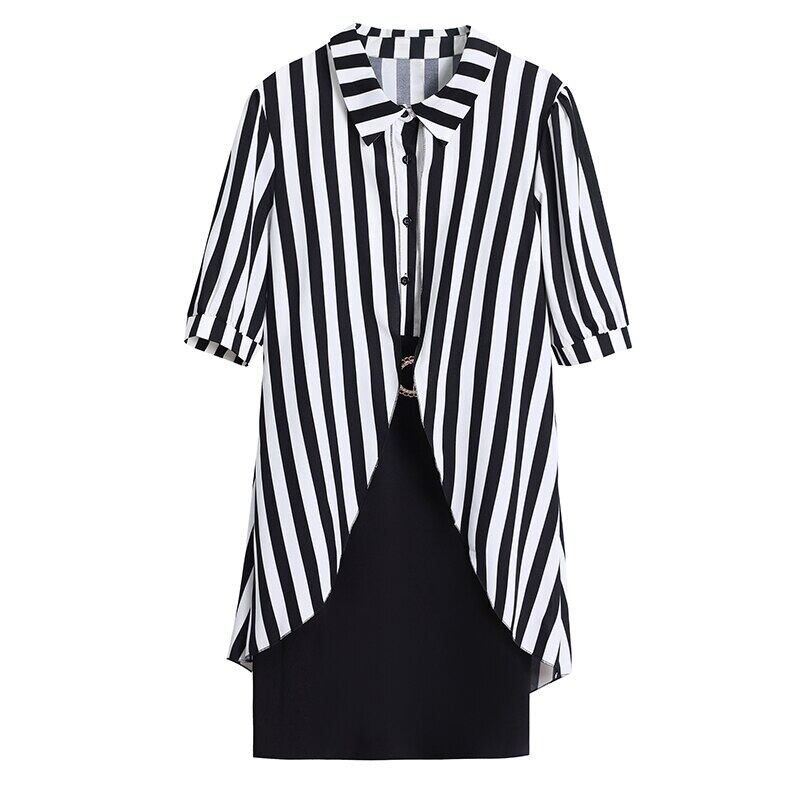オフィスストライプスプライシングフェイクツーピースミニドレス女性ターンダウン襟ウエストスリムシャツドレス女性服 会社 学校 通勤や通学にも
