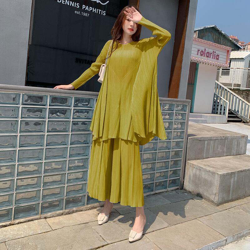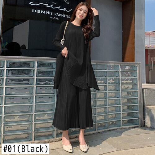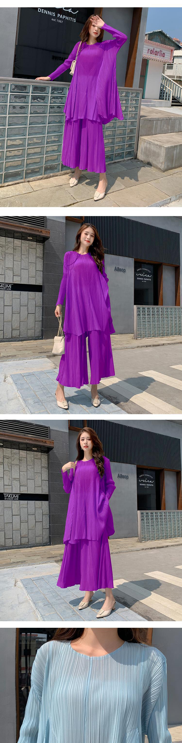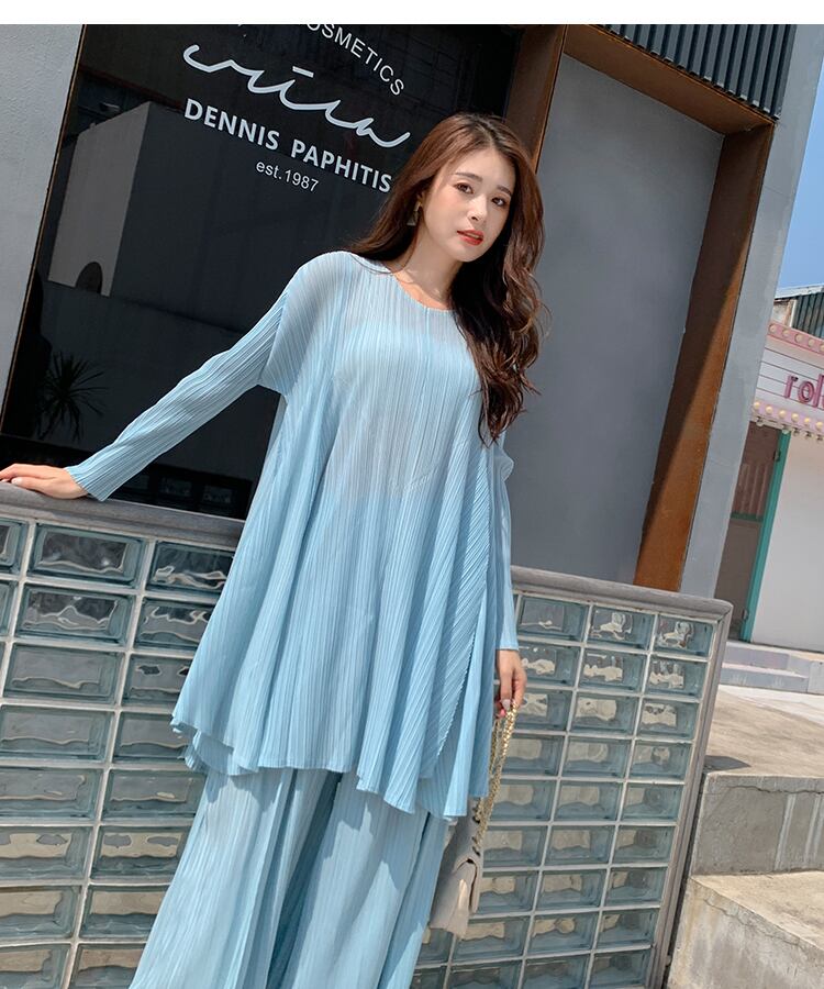 ミヤケ プリーツ ワイドレッグ パンツスーツ レディース 薄手 ゆったり ラウンドネック 大振り Tシャツ ウエストパンツ ツーピース セット コーデ Oネック ワイドパンツ