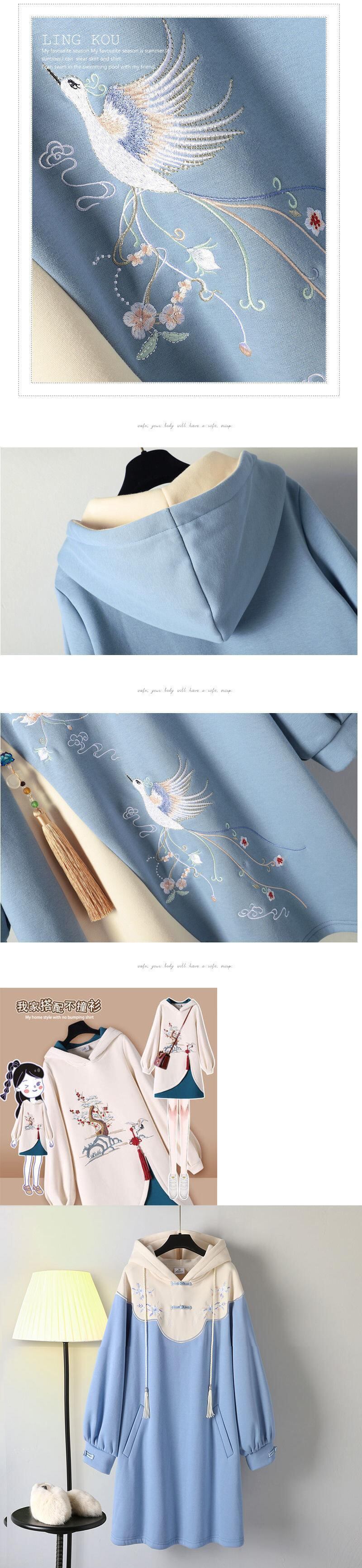 中国風のパーカーパッチワークチャイナ特大刺繍トレーナードレス秋冬女性バックル厚いフード付きドレス オータム 秋物 ウィンター 冬物