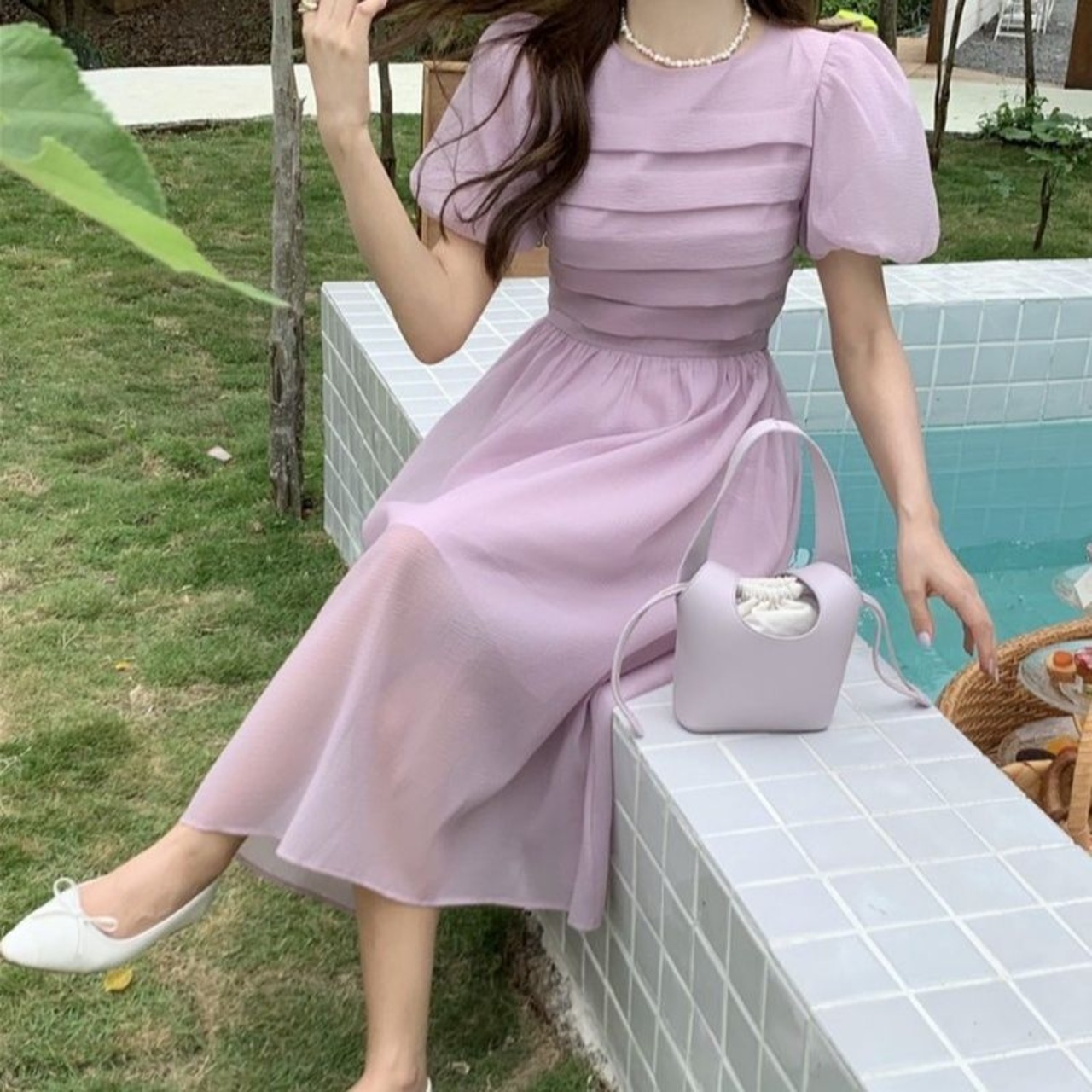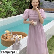 Y2K ルーズパフスリーブプリーツワイルドスリムドレス女性 2022 夏白紫緑ビーチドレスサンドレスローブ ホワイト サマー 夏物 グリーン パープル