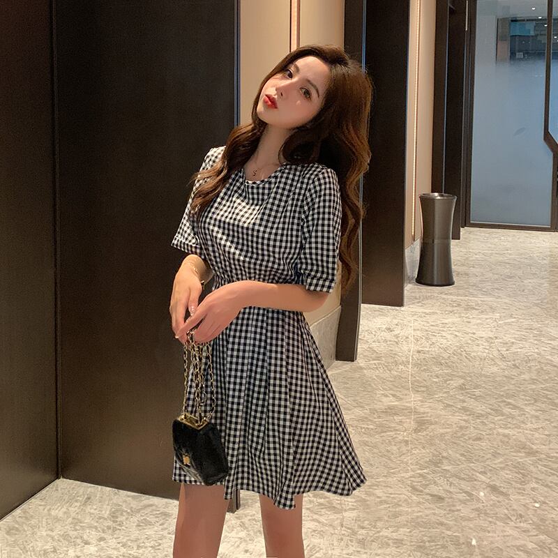 夏中空アウトウエストチェック柄ミニドレス女性半袖ラウンドネックスリムレースアップパーティードレス Vestidos ショート ハーフスリーブ サマー 夏物 Oネック