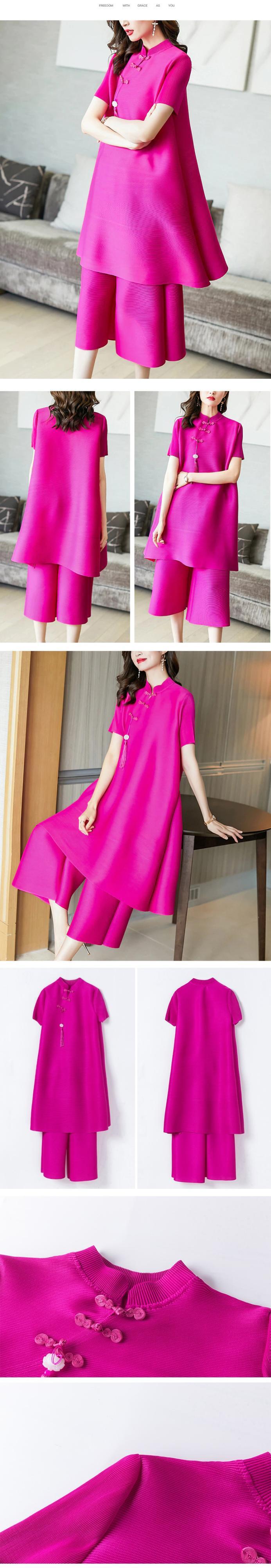 2021 中国風の女性ソリッドチャイナドレス + ワイドレッグパンツ弾性 2021 秋 2 個 miyake スーツ エラスティック 伸縮 オータム 秋物 ワイドパンツ ソリッドカラー