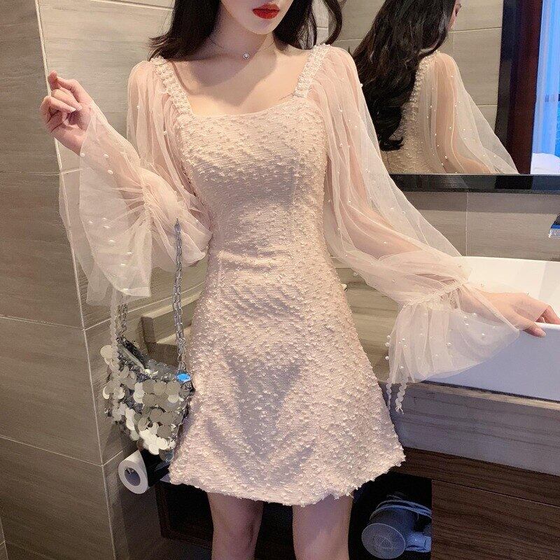 メッシュ長袖パッチワークビーズパーティードレス女性の夏のスクエアカラースリムウエストミニドレス Vestidos ロング サマー 夏物 スクウェア