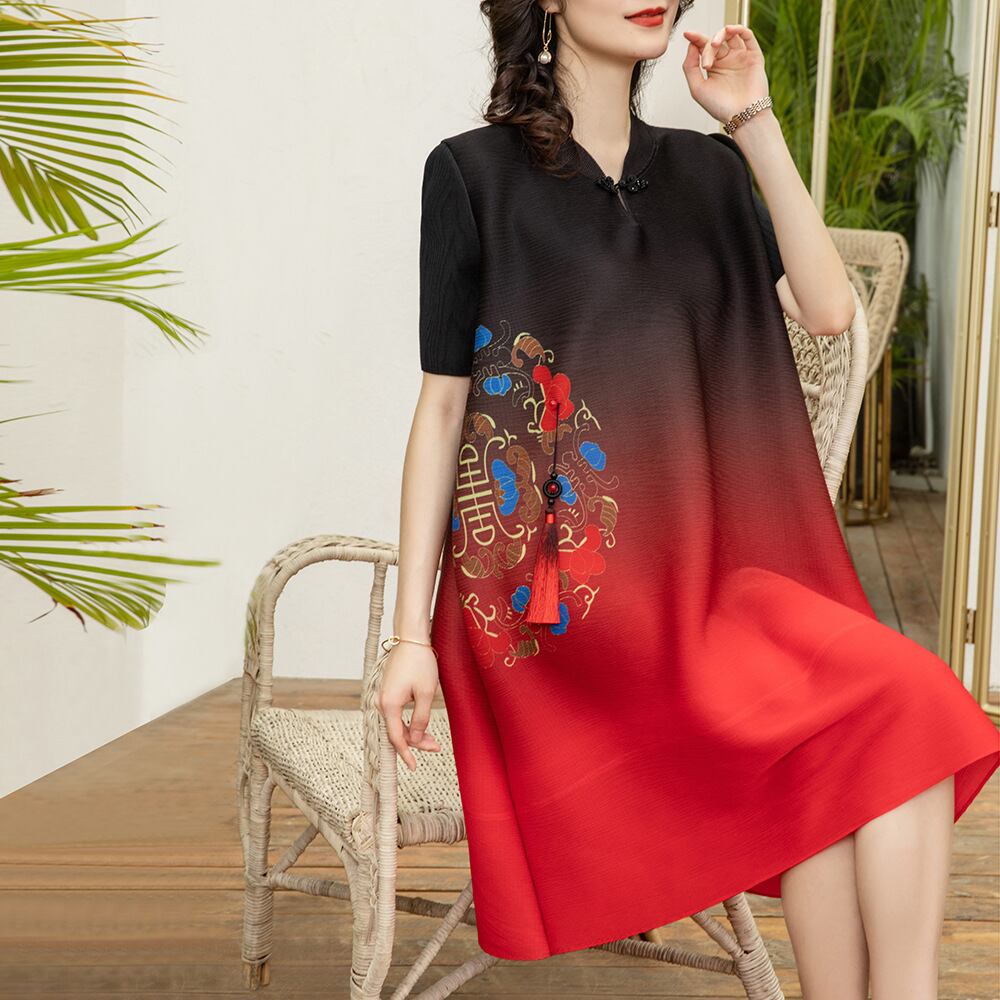 中国風のmiyakプリーツグラデーションプリントvネックルーズでスリムな成熟したドレスの女性のパーティーの結婚式