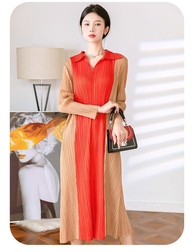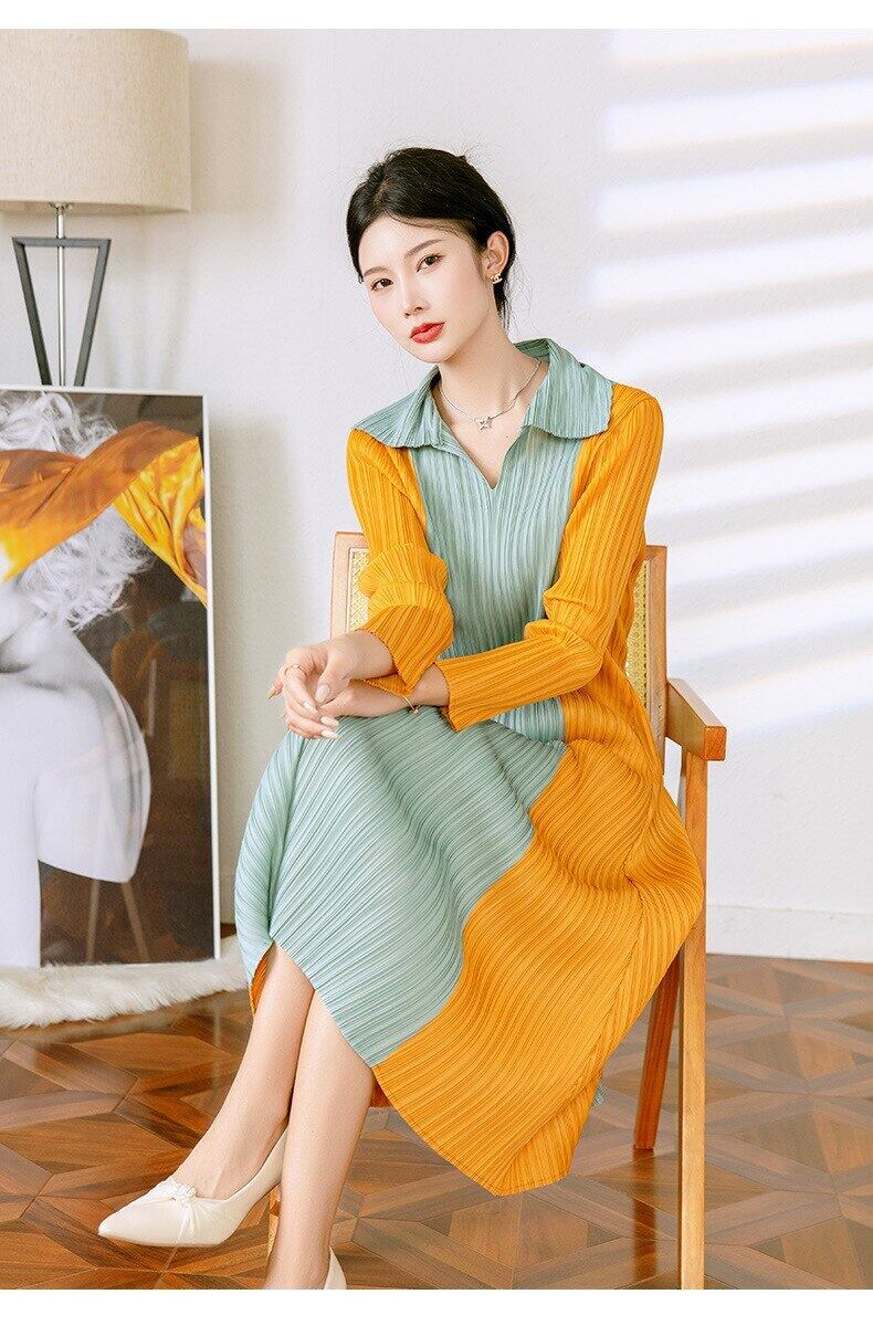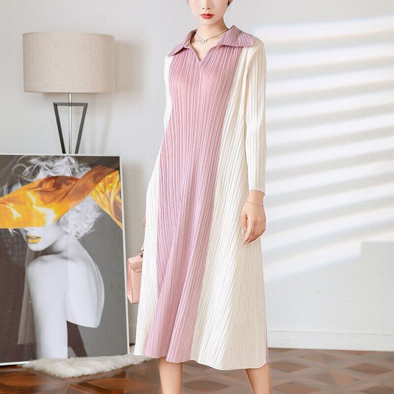 2022 ターンダウンカラーヒットザカラー Miyak プリーツミディドレスルーズロングスリーブドレス女性服 長袖