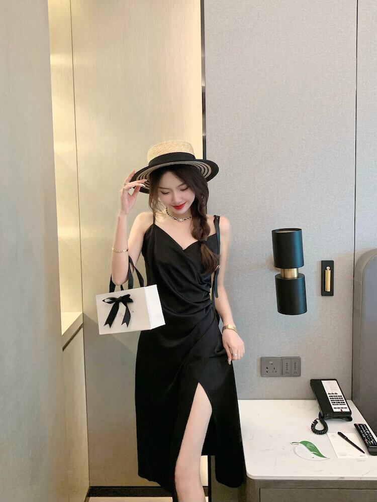 2022 夏プリーツスリット気質セクシーな V ネックサテンドレスブラックベージュブルーアセテートスリム非対称ミディサスペンダードレス サマー 夏物 Vネック