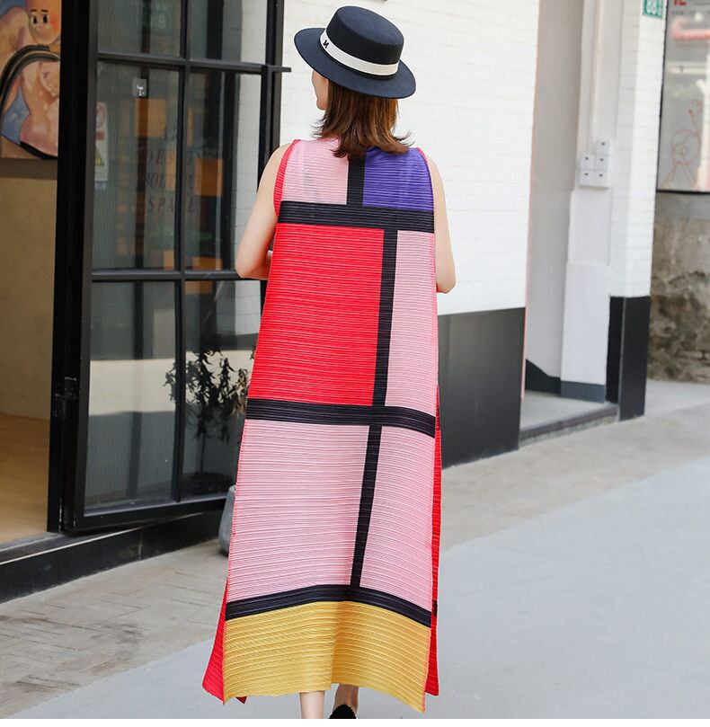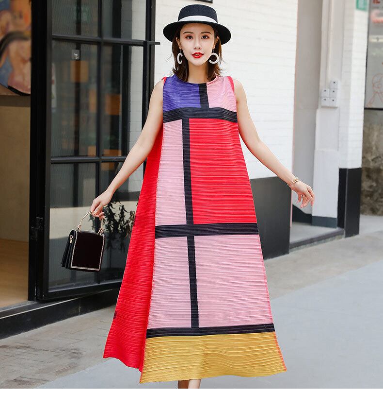 夏ノースリーブカラーステッチミヤケプリーツドレス女性ゆるい幾何学プリント A ラインミディドレスレディ サマー 夏物 Aライン