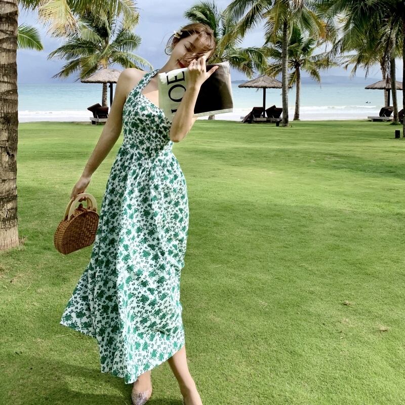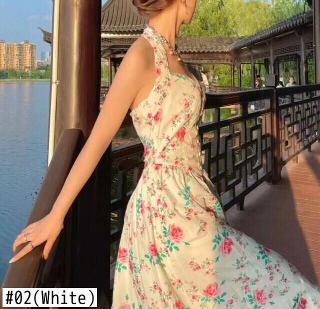 花柄ホルターネックロングドレス女性の夏のノースリーブスリムウエストフレンチパーティーセクシーな背中の開いた A ラインドレス サマー 夏物 Aライン