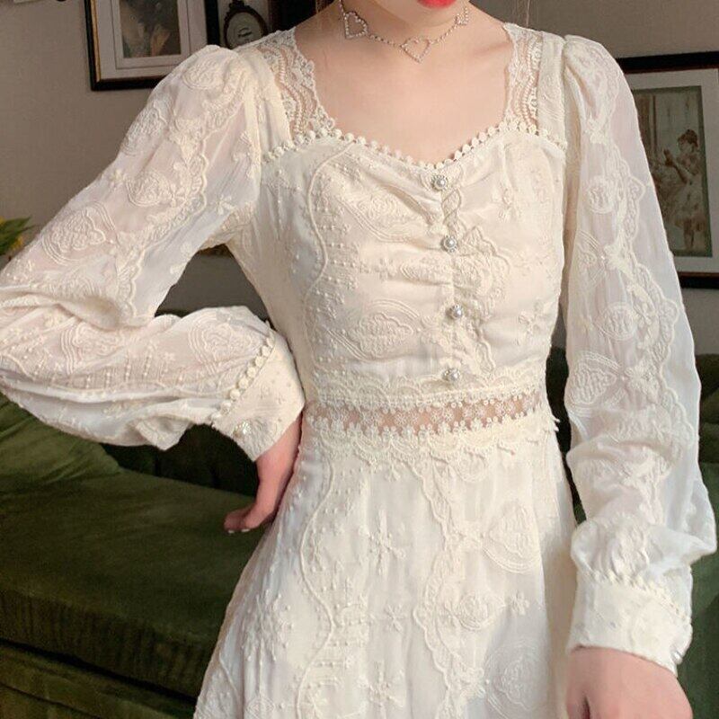 夏のレトロなフレンチドレスの女性のシックなレース中空ドレスフレンチかわいいパーティーホリデードレス サマー 夏物