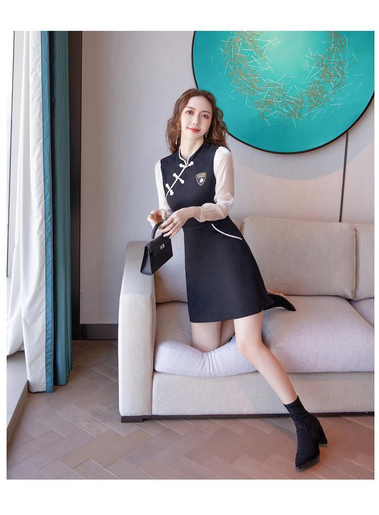 中国風の改良されたチャイナドレス女性長袖スタンドカラーレトロバックルウエストパッチワークミニドレス ロング