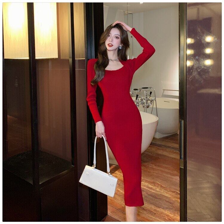 秋冬赤黒アプリコットセクシーなサイドスリットスリムワンステップドレススクエアネックボディコンニットドレス レッド ブラック オータム 秋物 ウィンター 冬物 スクウェア