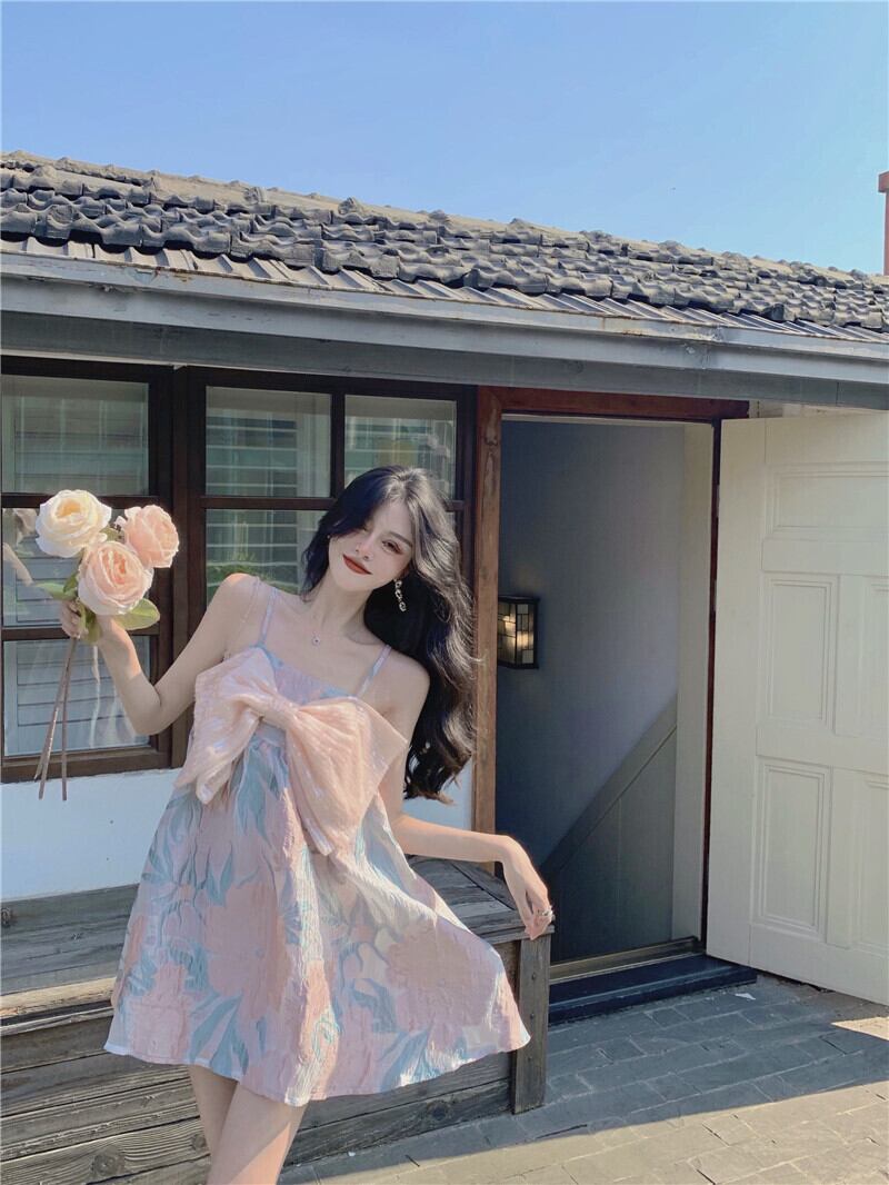 女性スパンコール弓フローラル フレンチ セクシーなミニ ドレス夏の甘いストラップ A ライン ビーチ ドレス リボン 大人ガーリー スウィート キュート カジュアル サマー 夏物 花柄 Aライン