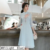 中国風の刺繍スタンドカラー改良されたチャイナ七分袖シフォン膝丈ドレス女性服