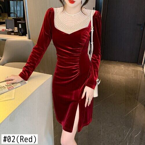 女性のセクシーな恋人 O ネック ビーズ ミディ パーティー ドレス クリスマス年ベルベット ボディコン イブニング ドレス スリット 大人ガーリー スウィート キュート カジュアル Oネック
