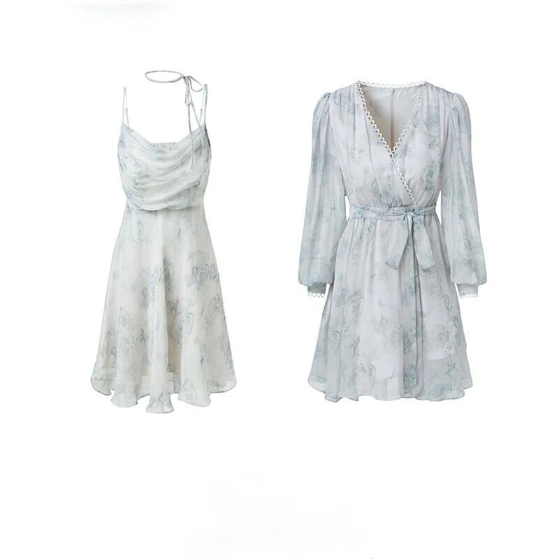 2021 セクシーな V ネックスパゲッティストラップ花柄薄型シフォンドレスの女性の夏の背中の開いた弾性ウエストパーティークラブミニドレス エラスティック 伸縮 サマー 夏物 Vネック
