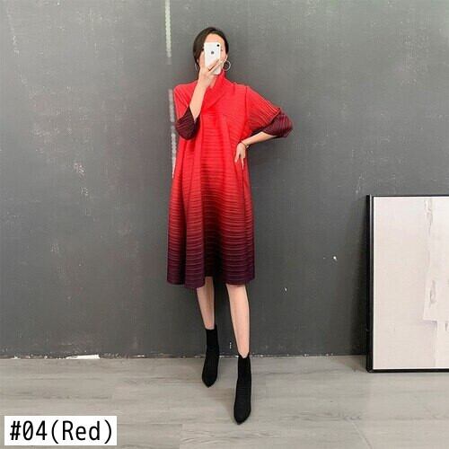 夏秋グラデーションカラースタンドカラー Miyak ドレス女性レッドブルーグリーングレー-エンドイブニングプリーツドレス サマー 夏物 オータム 秋物