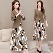 秋プリーツウエストスリム女性ツーピースセットシンプルな V ネックボタン印刷七分袖スーツ Vネック