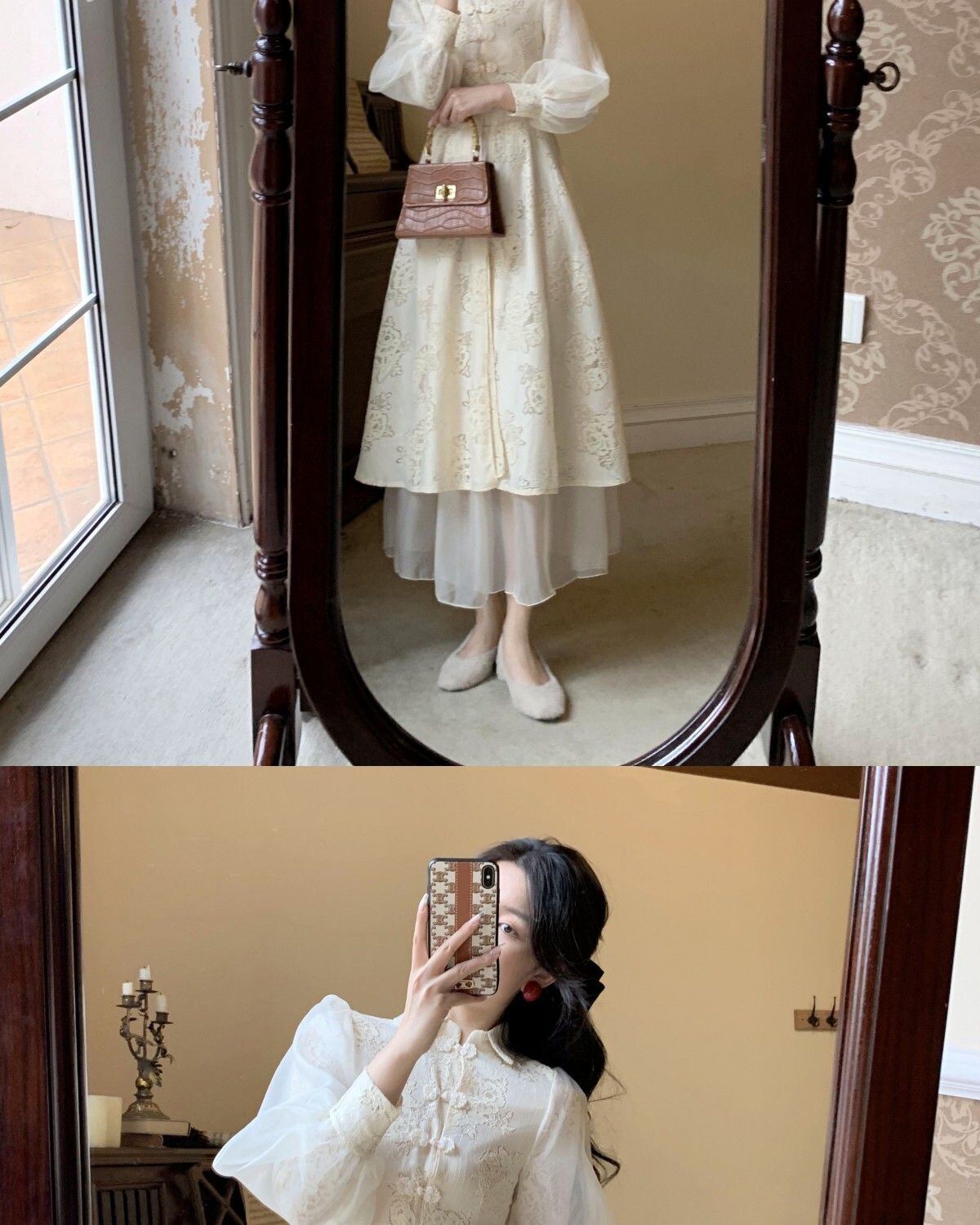 レースのレトロなバックル長袖パッチワーク メッシュ改良されたチャイナ ドレス中国風の 2 ピースの女性のドレス ロング