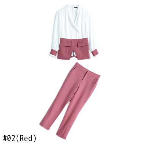 秋のスーツの女性パンツ 2 点セット オフィス レディ衣装ヒット カラー ブラウスとパンツ セット オータム 秋物 会社 学校 通勤や通学にも