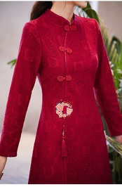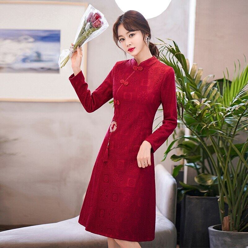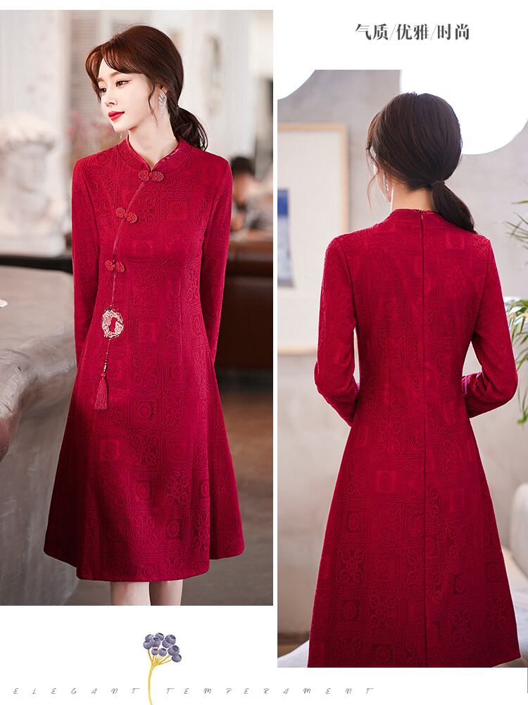 レース刺繍スタンドカラー長袖改良チャイナ女性中国風のスリムウエストパーティー膝丈ドレス ロング