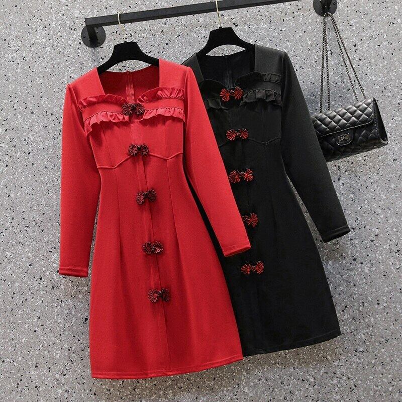 春長袖スリムバックル赤黒ドレス女性スクエアカラー中国風の年 A ラインドレス ロング レッド ブラック スプリング 春物 Aライン スクウェア