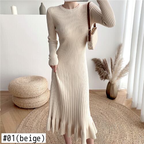 2022年秋冬 ミドル丈 ニット ボトムス ワンピース ブラック ピンク 長袖 ストライプ 大振りセーター ロング オータム 秋物 ウィンター 冬物