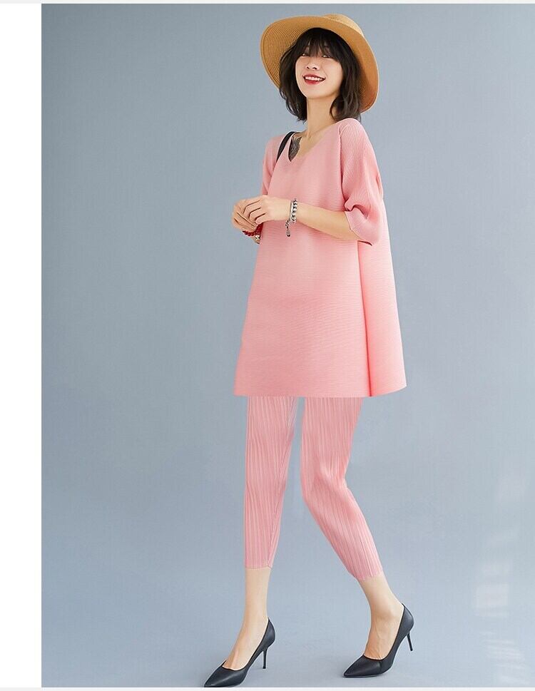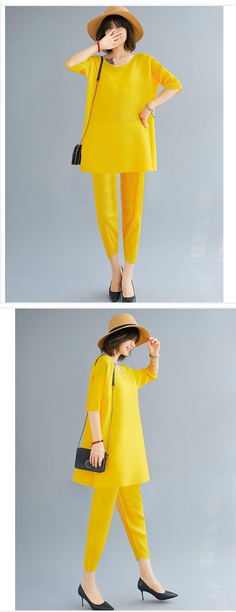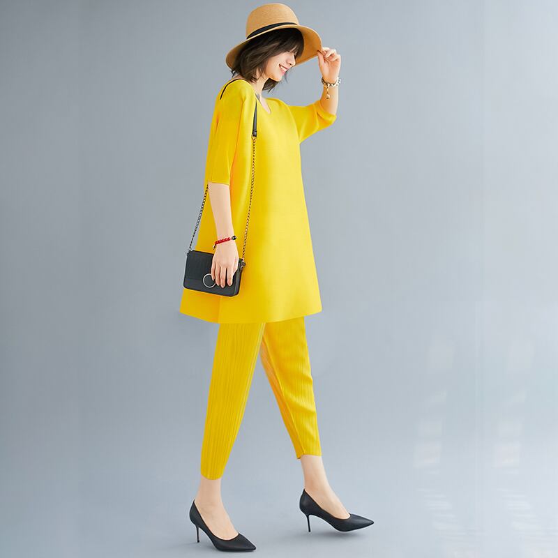三宅プリーツルース大サイズ純粋な色の気質のスーツの女性 2020 ファッション倍ツーピースヨーロッパカジュアルスタイルの女性セット 大きめサイズ ピュア ヨーロピアン