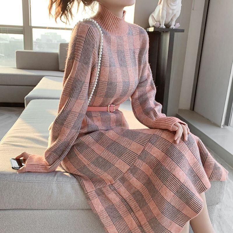-ネック厚手のセータードレス女性の秋と冬のウエスト膝丈フリルチェック柄ニットボトムドレスとベルト オータム 秋物 ウィンター 冬物 ハーネス