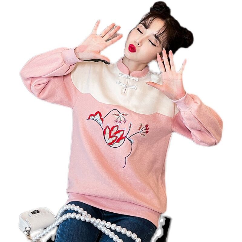 刺繍スタンドカラー長袖スウェットシャツ女性中国風のレトロなバックルルーズセータープルオーバー ロング
