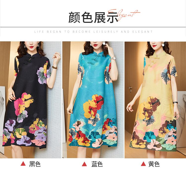 Miyak プリーツ改良されたチャイナ花柄ルース女性の夏のバックルレトロなドレスの女性の中国風の袍 サマー 夏物