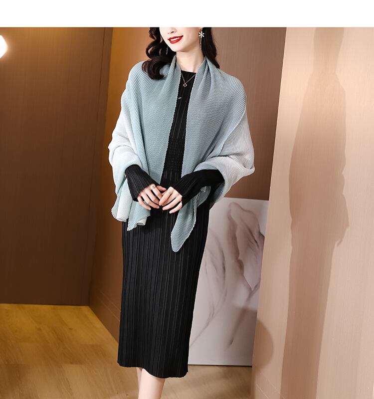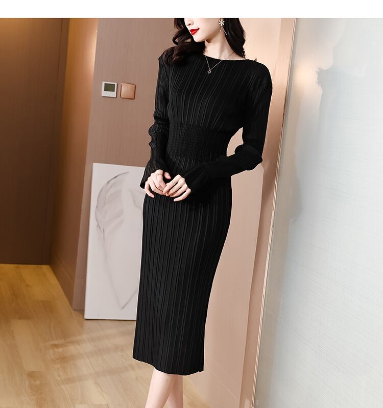 春長袖スリムウエスト Miyak プリーツドレス女性ソリッドラウンドネックストレッチミディドレス服 ロング スプリング 春物 Oネック ソリッドカラー