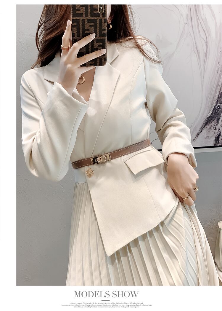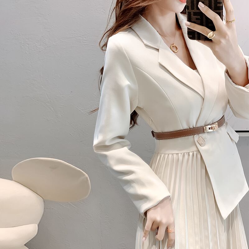 秋の女性のオフィススーツドレス長袖ウエストターンダウン襟ボタンプリーツミディドレスとベルトの服 ロング オータム 秋物 ハーネス 会社 学校 通勤や通学にも