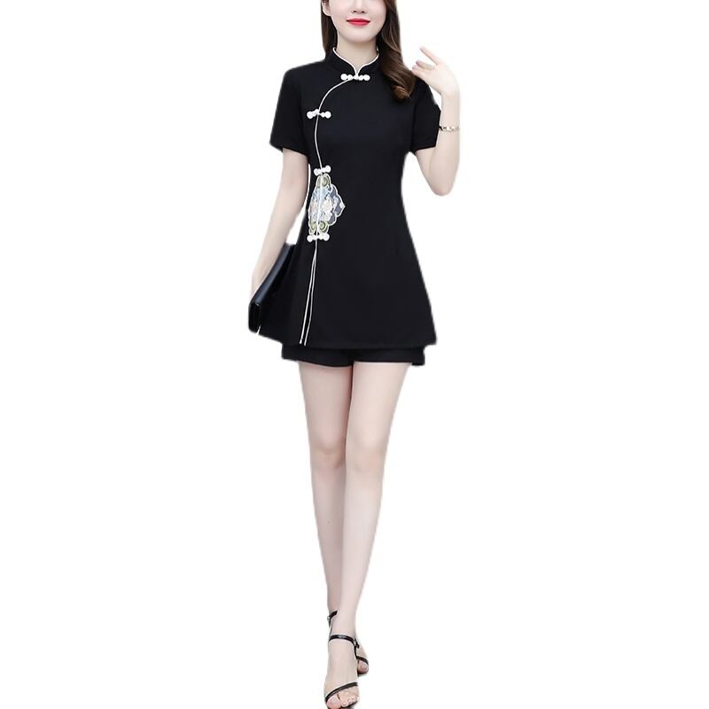 2022 夏秋レトロな中国風の改良されたチャイナミニドレススーツ黒スリムプラスサイズショーツ 2 点セット 5xl ブラック 大きめサイズ サマー 夏物 オータム 秋物 ブルマー