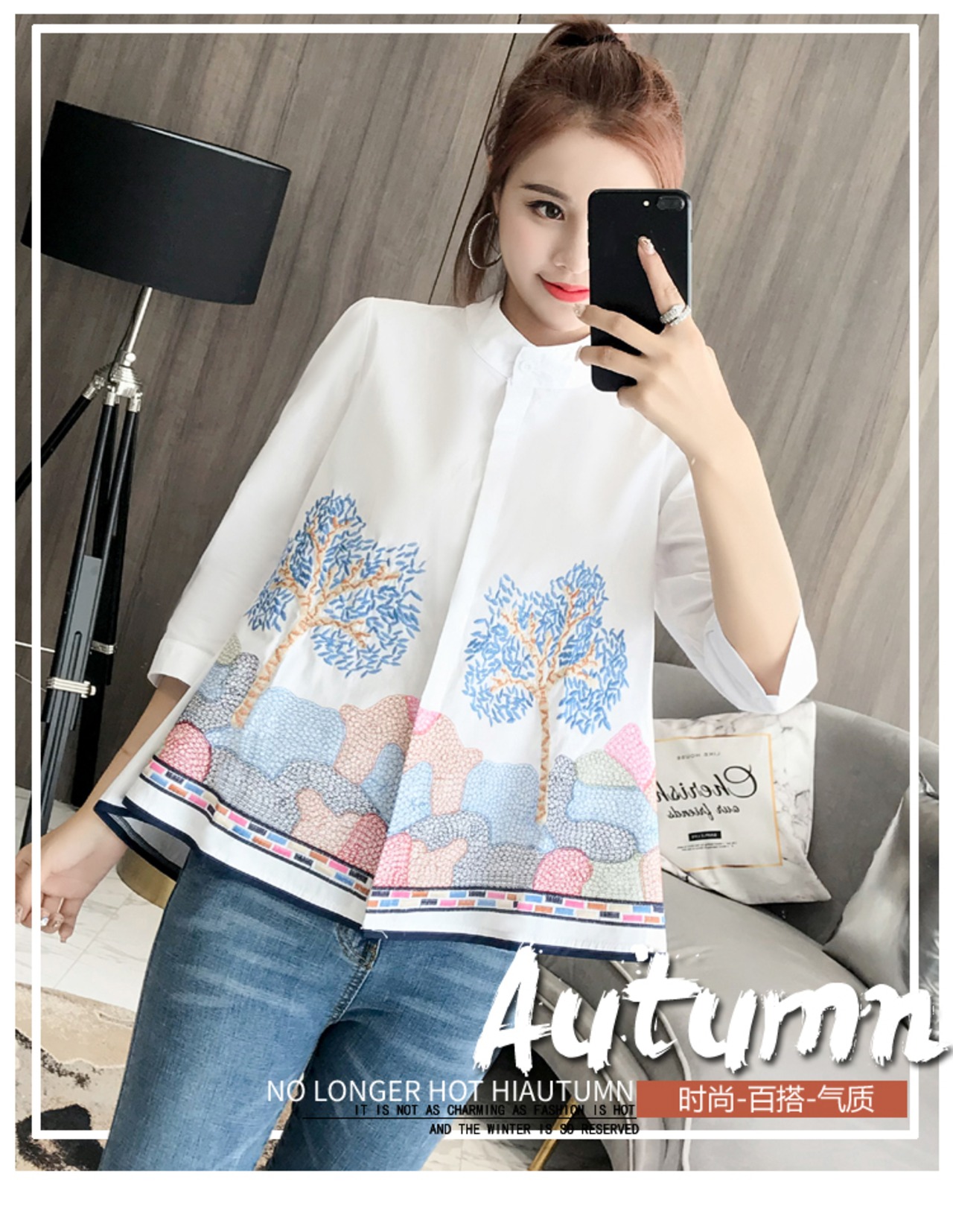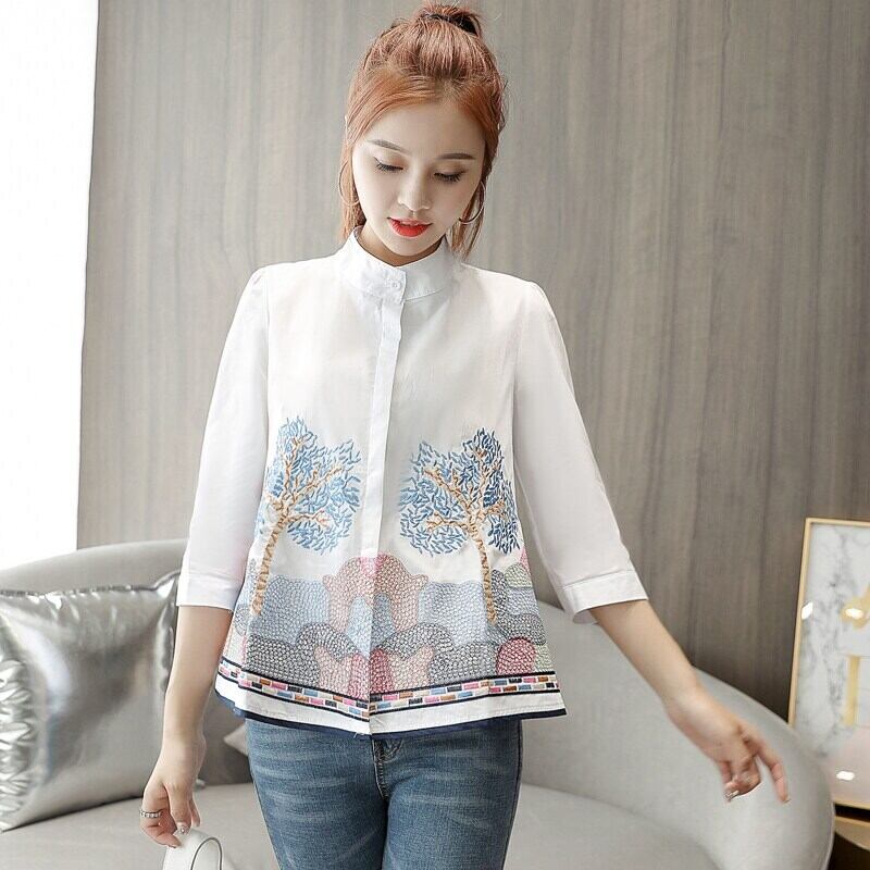 春 スタンドカラー 七分袖 シャツ ゆったり ツリー刺繍 ブラウス シャツ ビジネス おしゃれ トップス スプリング 春物