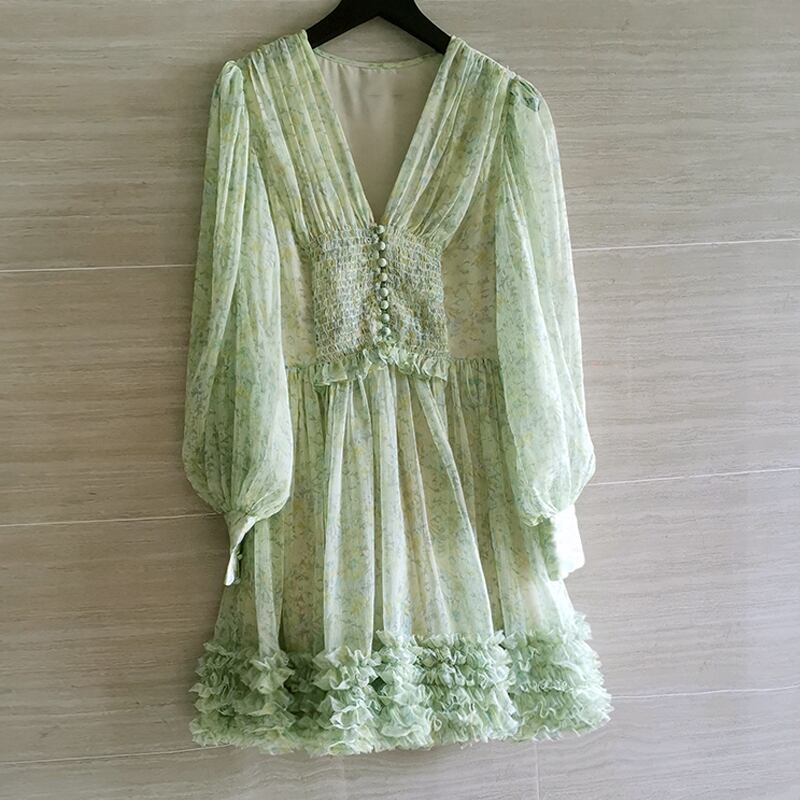 Y2K トレンド シフォン ドレス センス ニッチ フローラル フェアリー Vネック 2022 春 秋 パフスリーブ プリーツ ドレス スプリング 春物 オータム 秋物 花柄