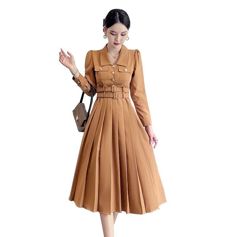 2022 秋と冬のレディースフレンチセレブラグジュアリーシックラペルプリーツ長袖秋スーツドレスとベルト ロング ウィンター 冬物 ハーネス