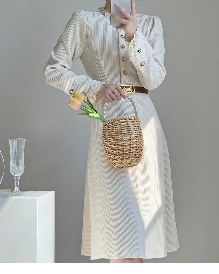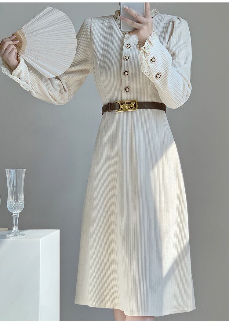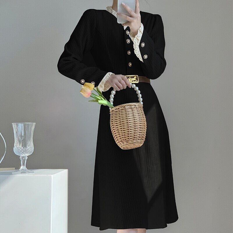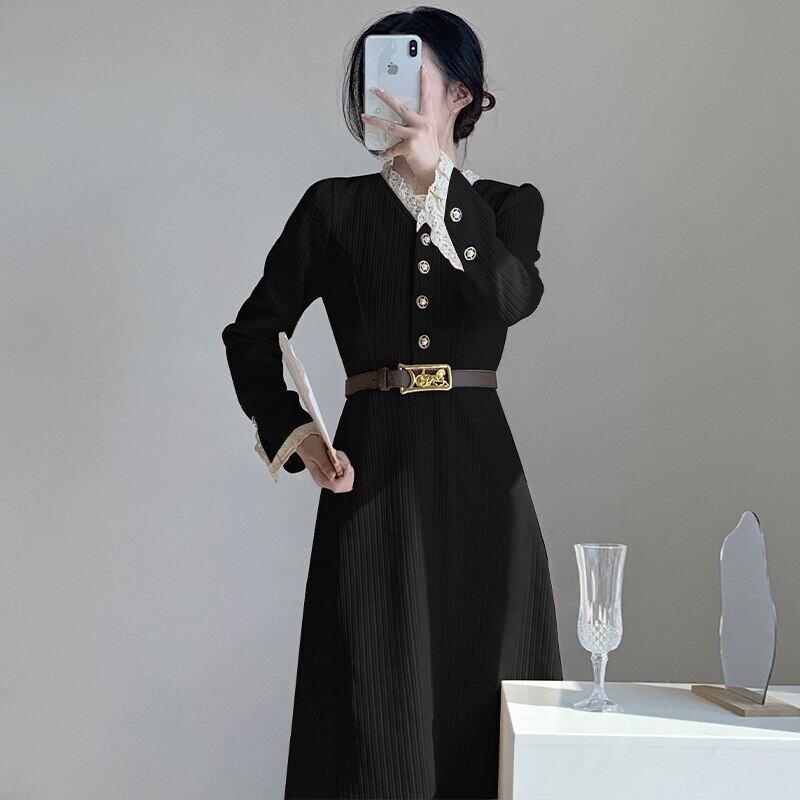 2023 秋と冬の気質ドレスフレンチレトロ長袖レーススプライシングコーデュロイドレスとブレットスリムドレス ロング オータム 秋物 ウィンター 冬物