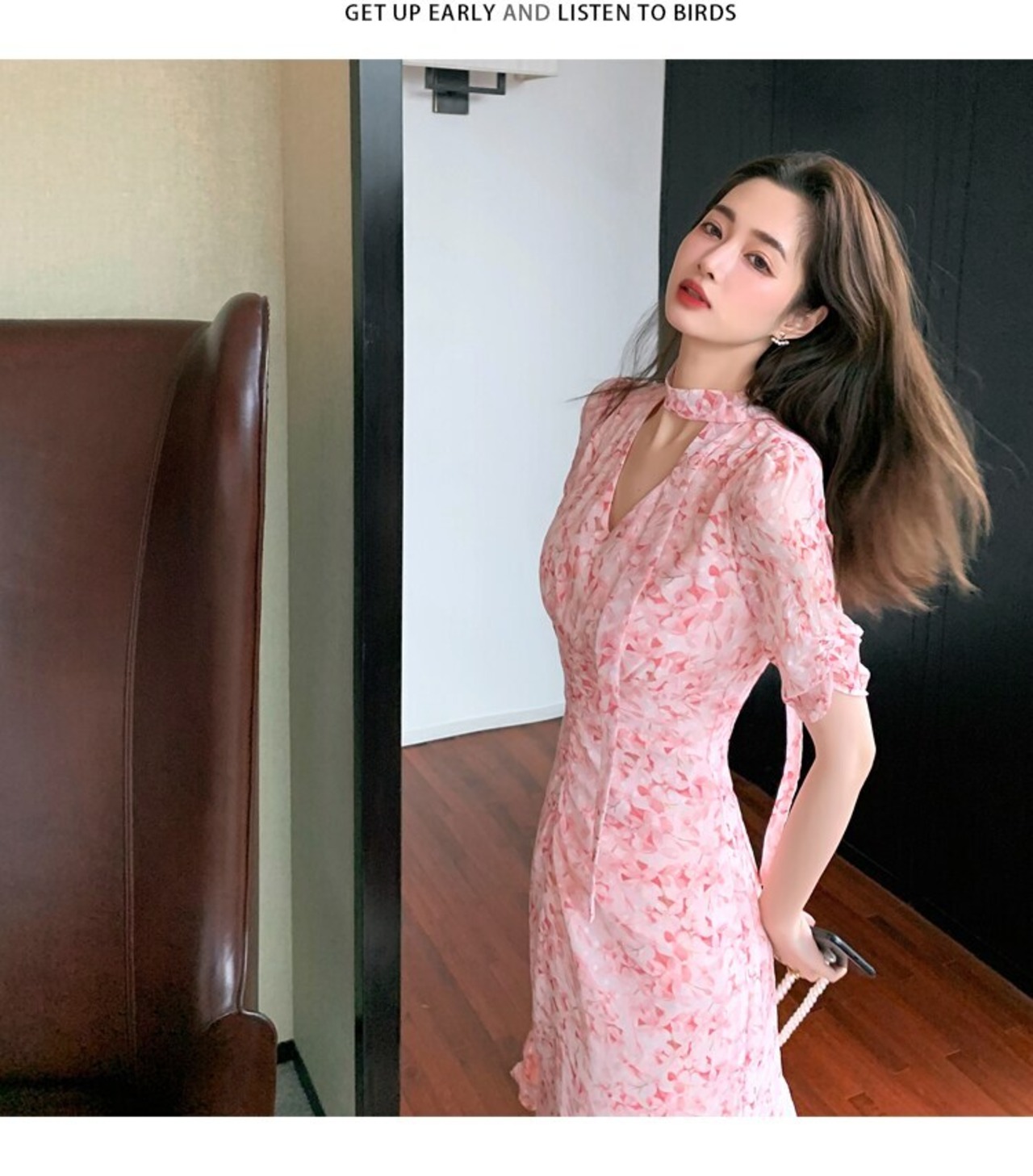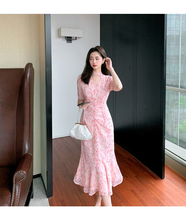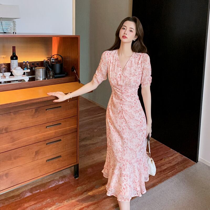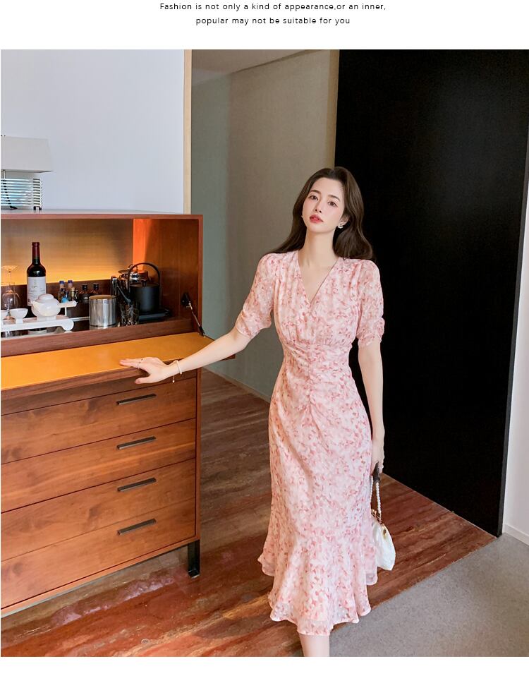 女性用サマードレス半袖フローラルピンクVネックフローラルウエストミディフィッシュテールドレス2022 ショート ハーフスリーブ 夏物 花柄