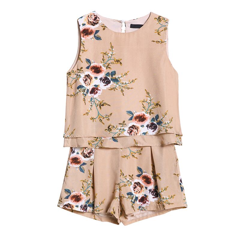 スーツ夏ノースリーブプリントシフォンシャツトップワイドレッグショーツツーピーススーツ女性服セット サマー 夏物 ブルマー ワイドパンツ