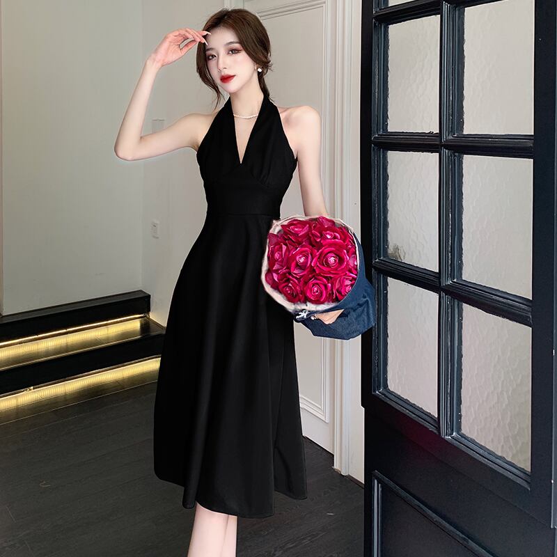 ヘップバーン レッド ブラック ビーチ サマー サンドレス レディ セクシー Vネック ウエスト付き スリムフィット ホルターネック ミディドレス 結婚式 夏物