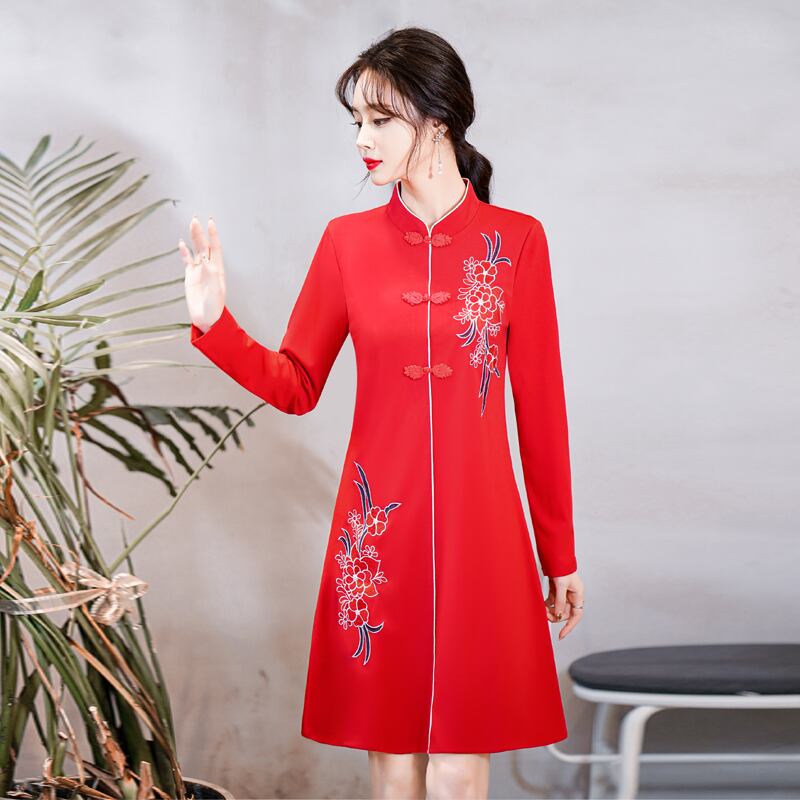 中国風の刺繍改良されたチャイナ女性秋長袖スタンドカラーバックルドレス袍服 ロング オータム 秋物