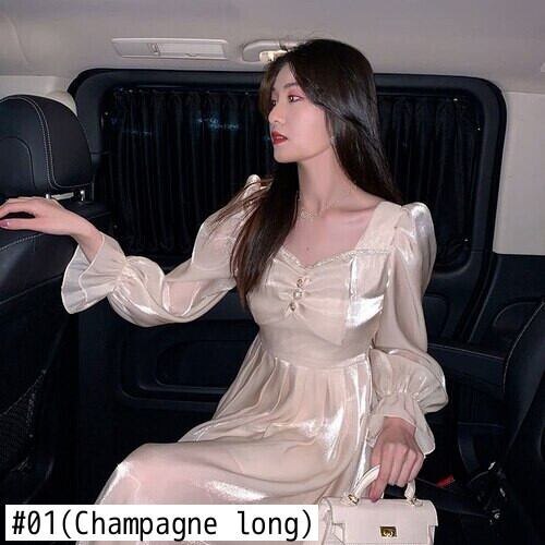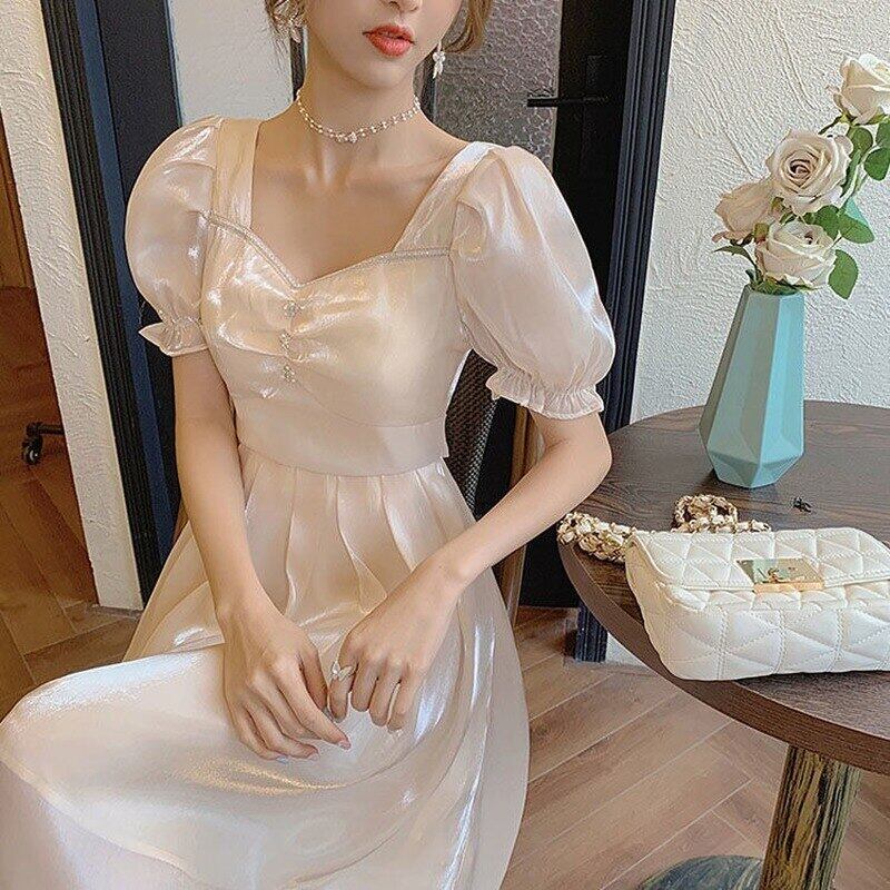 プラスサイズの女性の夏の高級イブニングドレスの女性 2022 ウエストスリム弓シルクスクエアネックパフスリーブ明るいミディドレス 4xl リボン 大きめサイズ サマー 夏物 スクウェア