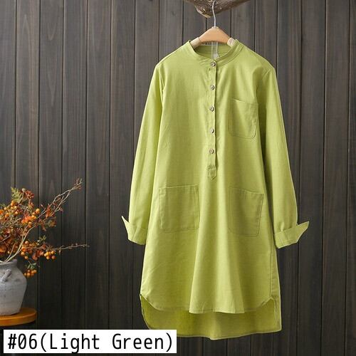 ソリッドシングルブレスト長袖スタンドアップカラー綿とリネン不規則なシャツドレス女性大サイズのミニドレス ロング コットン 大きめサイズ ソリッドカラー