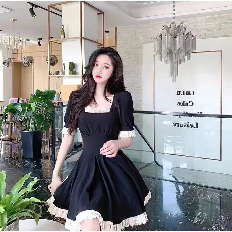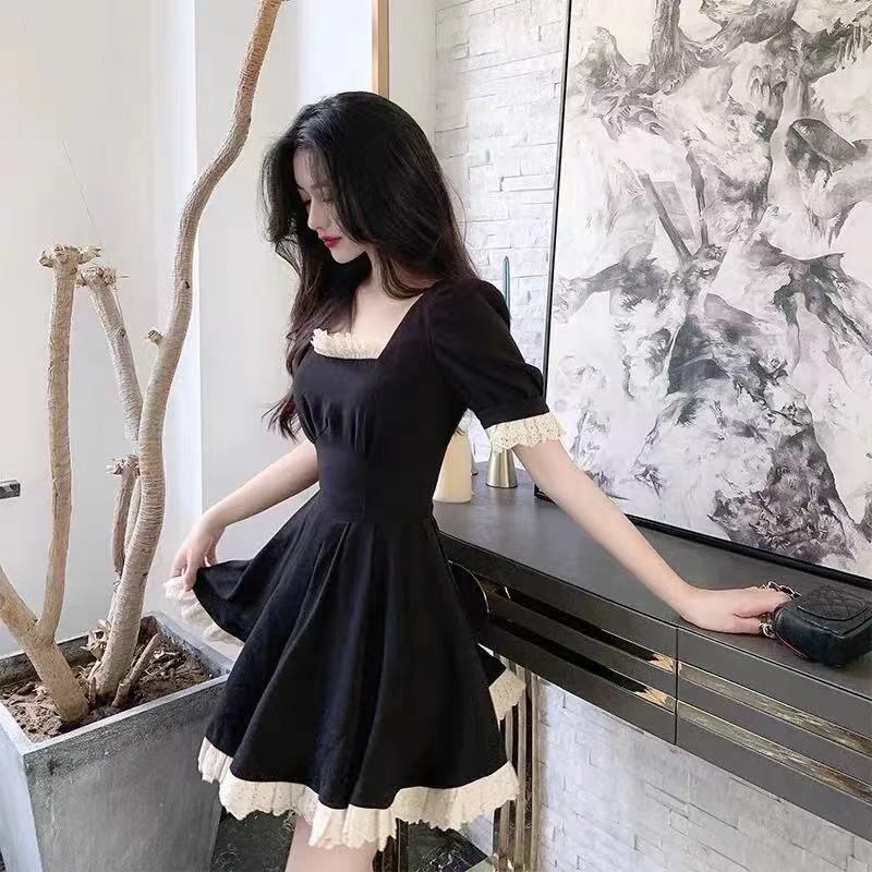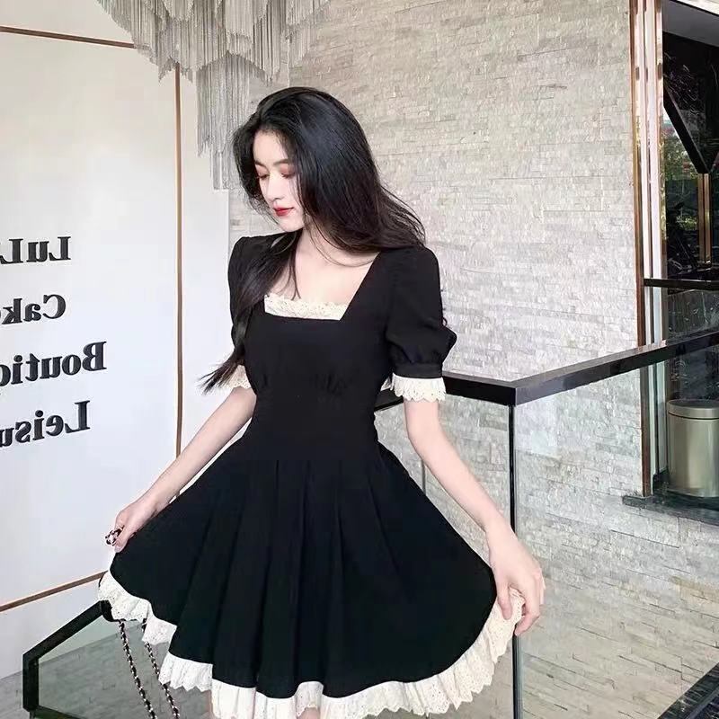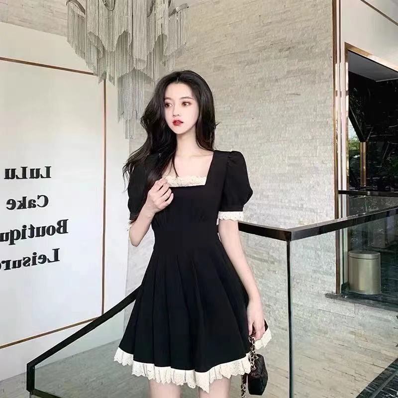 夏半袖レースパッチワークスリムウエストミニドレス女性フレンチスクエアカラーパーティー黒ドレス ショート ブラック ハーフスリーブ サマー 夏物 スクウェア