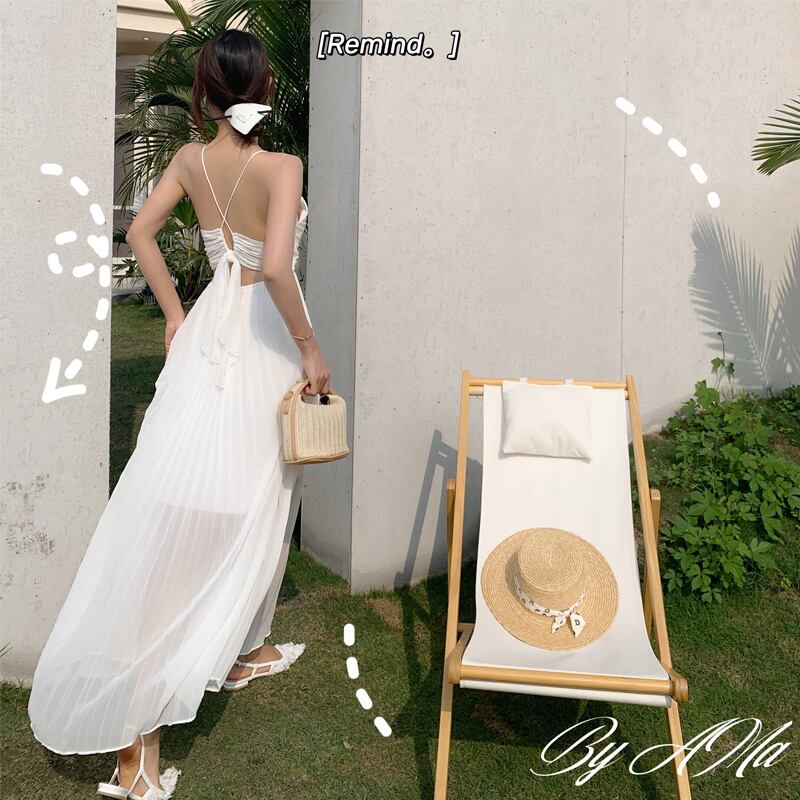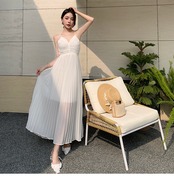 夏セクシーな白ディープ V ネック質感シフォンシックなエンドサスペンダーロングドレス女性の 2022 プリーツビーチドレスローブ ホワイト レッド サマー 夏物 Vネック