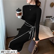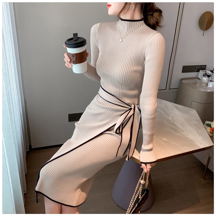 2022 秋冬シックな Kintted ドレススリムウエストレースアップミッドレングスセータードレスベルト女性 Vestidos オータム 秋物 ウィンター 冬物 ハーネス