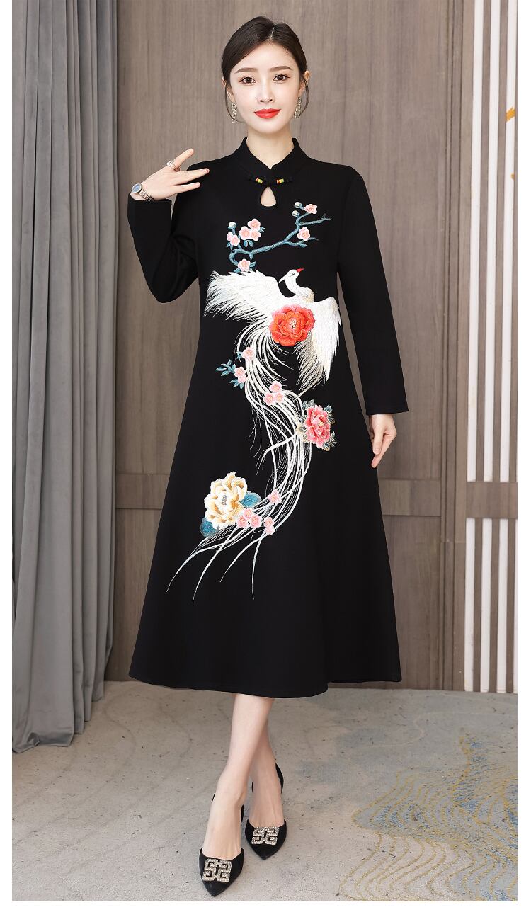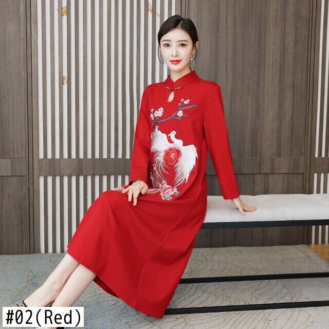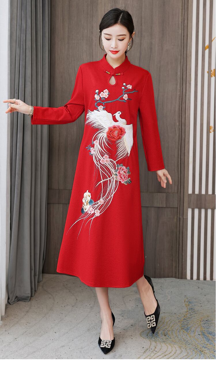 中国風の刺繍スタンドカラー改良されたチャイナドレス女性秋長袖ルーズレッド年赤ミディドレス ロング オータム 秋物